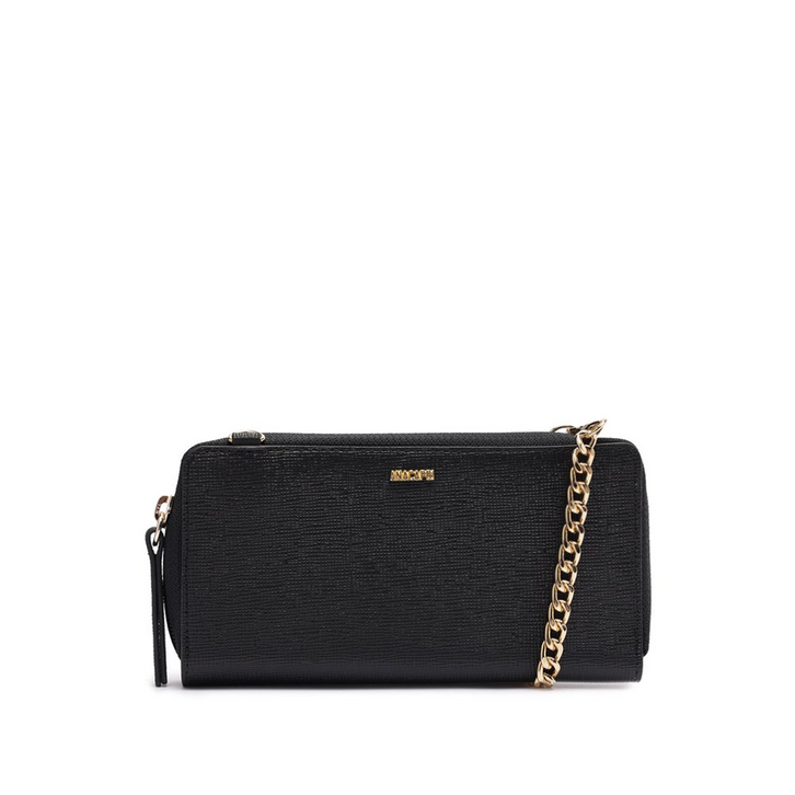 Carteira clutch, na cor preta. O acessório tem formato retangular em material similar ao couro, com acabamento a fio pintado. Traz alça transversal e removível em correntaria imponente e ombreira com regulagem. Forrada, acomoda celular com segurança e possui porta-cartão interno - com duas divisórias para acomodar cartões e documentos. Possui fechamento superior em zíper. Apresenta aplicação de pin metálico com assinatura Anacapri, centralizado na parte superior da capa frontal. 2 em 1, o modelo pode ser utilizado como bolsa ou carteira.