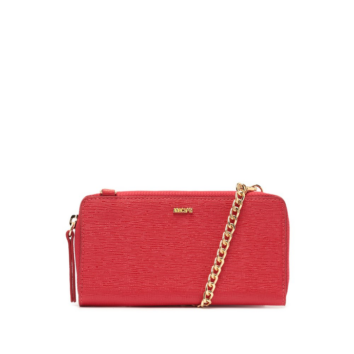 Carteira clutch, na cor vermelha. O acessório tem formato retangular em material similar ao couro, com acabamento a fio pintado. Traz alça transversal e removível em correntaria imponente e ombreira com regulagem. Forrada, acomoda celular com segurança e possui porta-cartão interno - com duas divisórias para acomodar cartões e documentos. Possui fechamento superior em zíper. Apresenta aplicação de pin metálico com assinatura Anacapri, centralizado na parte superior da capa frontal. 2 em 1, o modelo pode ser utilizado como bolsa ou carteira.