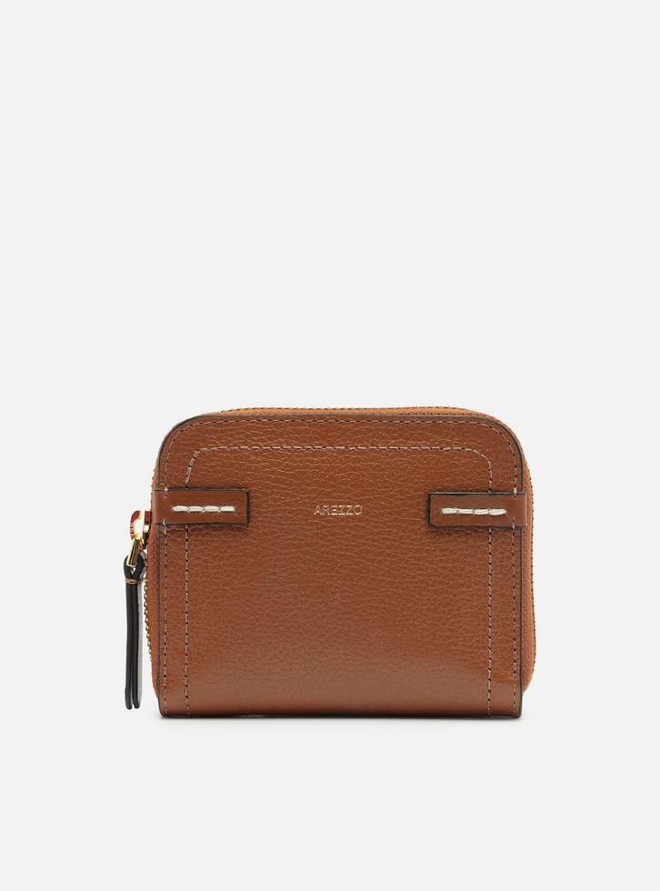 Carteira feminina média marrom de couro. O acessório tem formato quadrado, acabamento texturizado, contorno em costura pesponto e fecho superior em zíper com puxador. Parte interna na cor da carteira, com porta-cartões e bolso estilo envelope. Com nome da marca na capa e detalhe em tiras nas laterais com pesponto.
