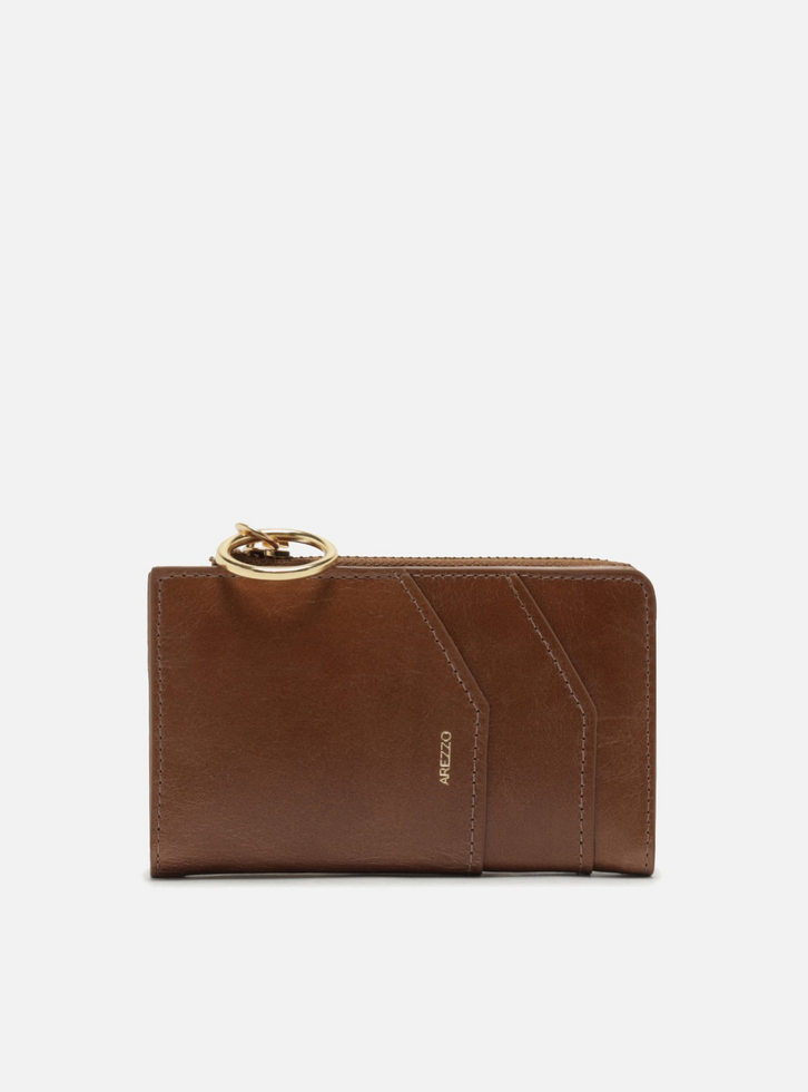Carteira feminina média marrom de couro. O acessório tem formato retangular, bolso com fecho superior e lateral em zíper e puxador em metal orgânico dourado. Parte frontal com porta-cartões. Com nome da marca na capa.