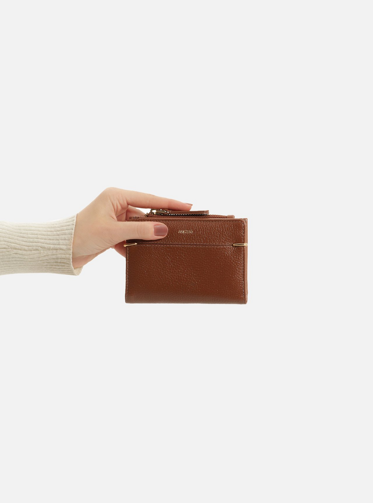 Carteira feminina pequena marrom de couro. O acessório tem formato quadrado e acabamento texturizado. Possui bolso superior com zíper e puxador. Parte interna na cor da carteira com divisórias e porta-cartões. Com detalhe em metais nas laterais da parte superior e inscrição do nome da marca.