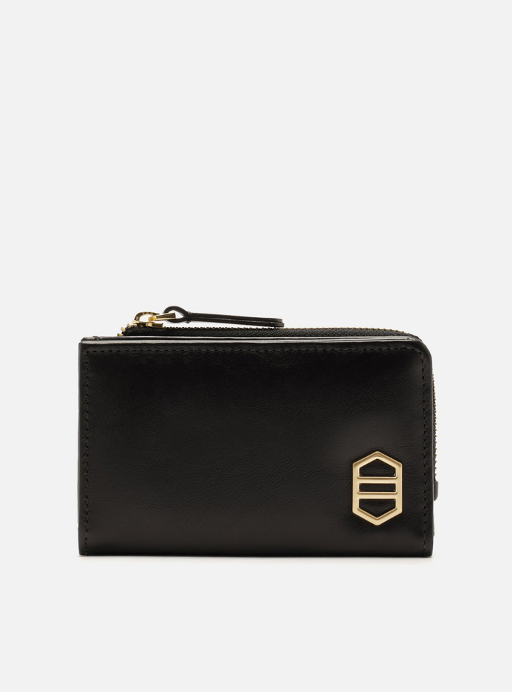Carteira feminina grande de couro preta. O acessório tem formato retangular, acabamento macio e bolso com zíper que vai até a lateral, além de puxador. Traz aplicação de metal geométrico e vazado na lateral da capa. Fecho em botão e parte interna com divisórias e porta-cartões.