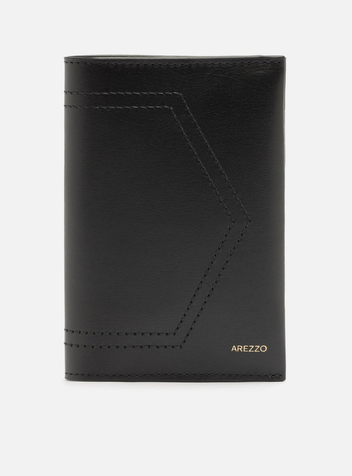 Carteira feminina média preta de couro. O acessório tem formato retangular e é dobrável. Parte interna na cor da carteira com porta-cartões. Com contorno em costura pesponto, nome da marca na capa e costura geométrica.