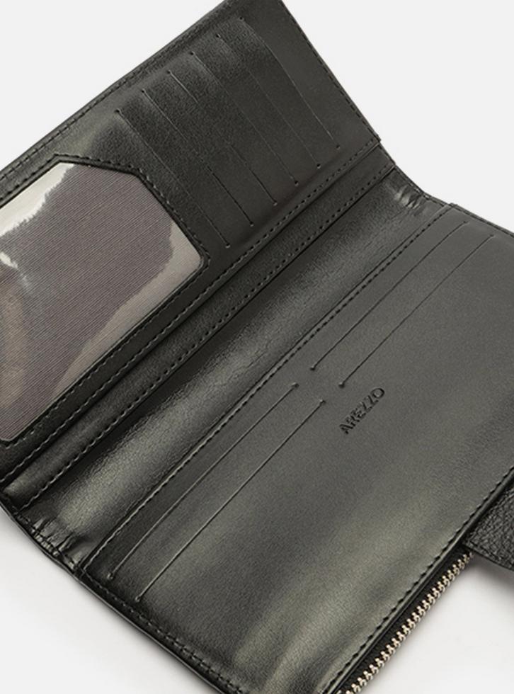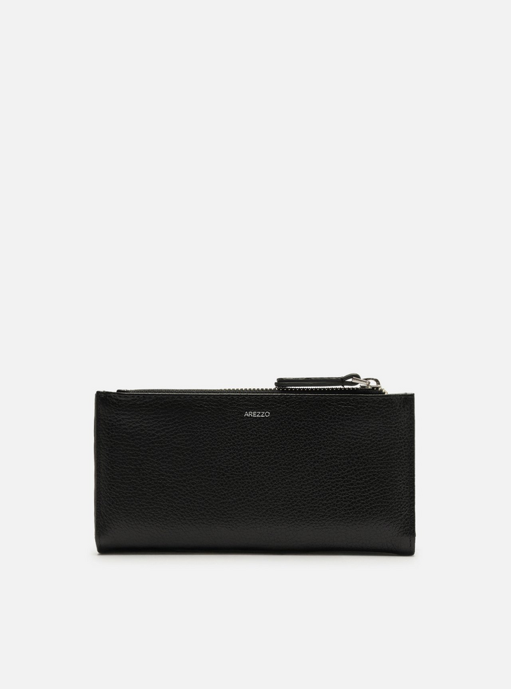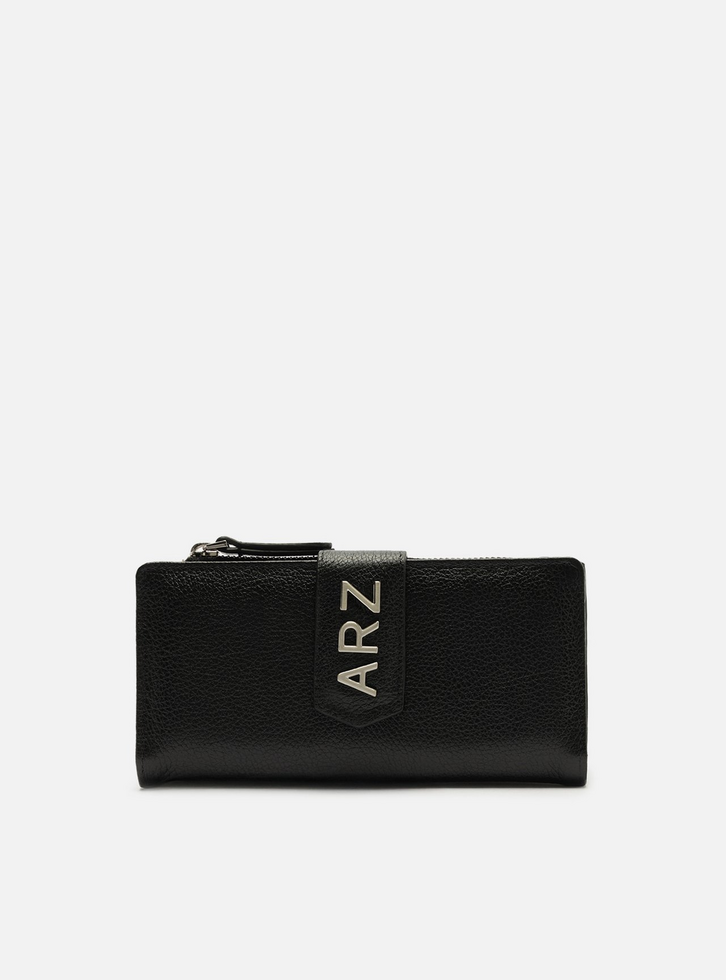 Carteira média feminina preta de couro. O acessório tem formato retangular e acabamento texturizado. Possui bolso superior com zíper e puxador e tira vertical com aplicação das letras ARZ em metal. Parte interna na cor da carteira com divisórias e porta-cartões.