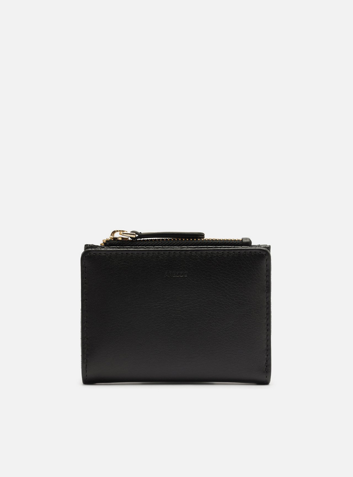 Carteira feminina pequena preta de couro. O acessório tem formato quadrado, acabamento liso e fecho superior em zíper com puxador. Parte interna na cor da carteira com divisórias e porta-cartões. Com nome da marca na capa.