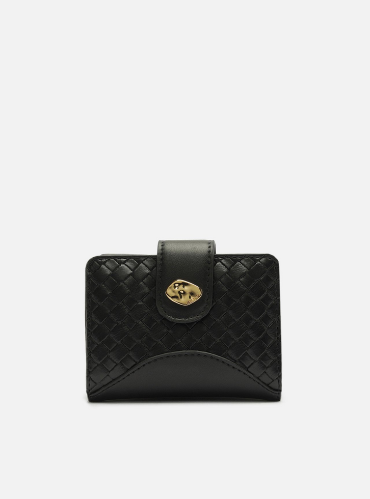 Carteira feminina pequena preta. O acessório tem formato quadrado e capas em tressê. Possui fecho em lapela com detalhe em metal dourado orgânico e botão. Parte interna na cor da carteira com divisórias e porta-cartões. Com inscrição do nome da marca na parte interna.