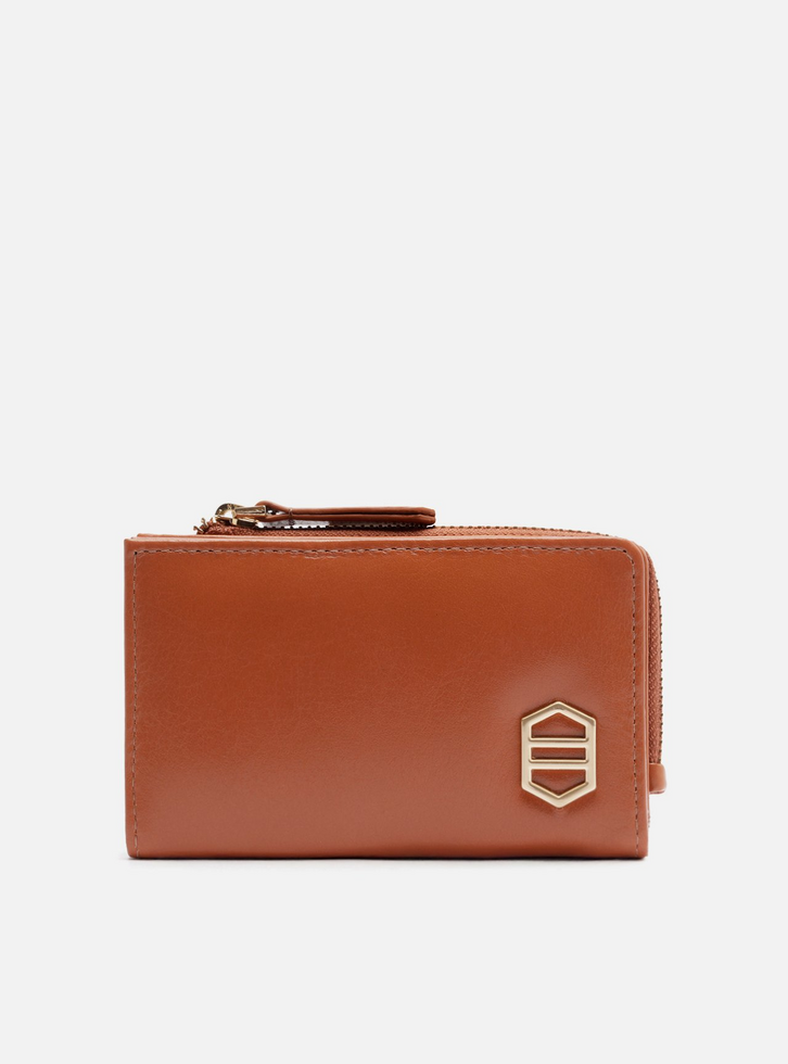 Carteira feminina grande de couro marrom-alaranjada. O acessório tem formato retangular, acabamento macio e bolso com zíper que vai até a lateral, além de puxador. Traz aplicação de metal geométrico e vazado na lateral da capa. Fecho em botão e parte interna com divisórias e porta-cartões.