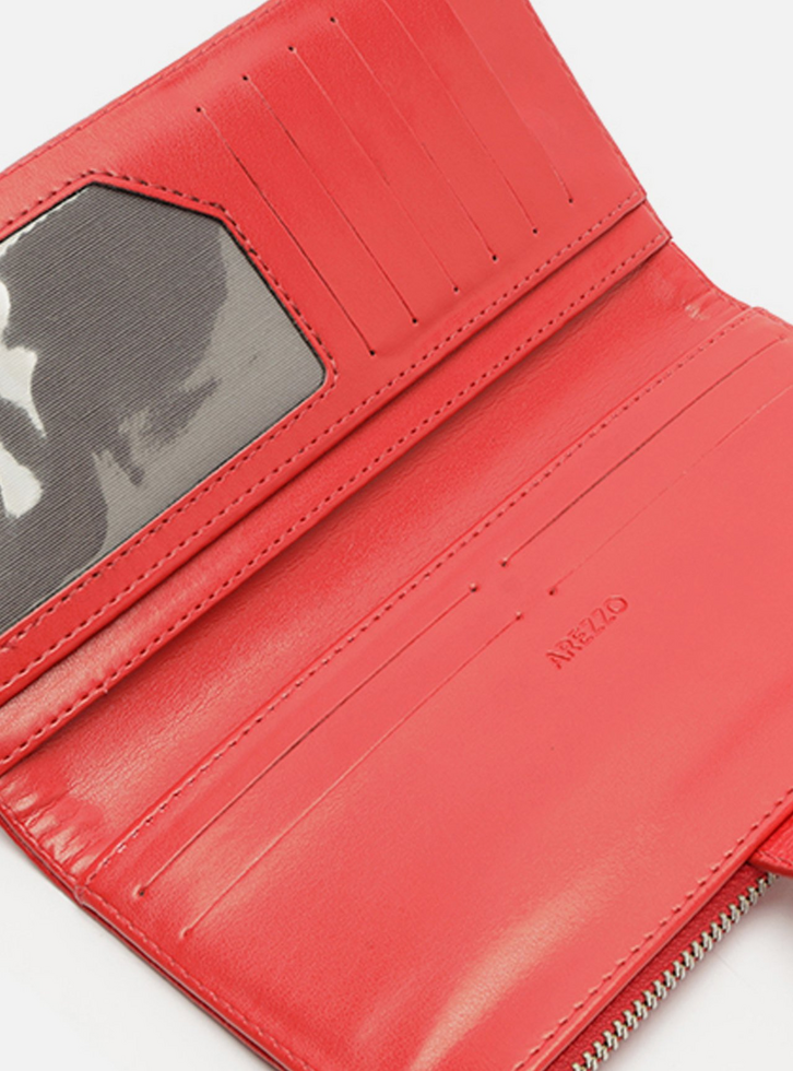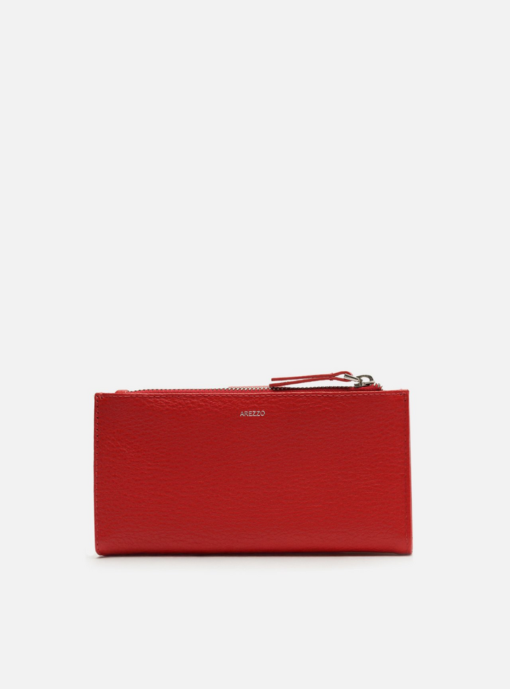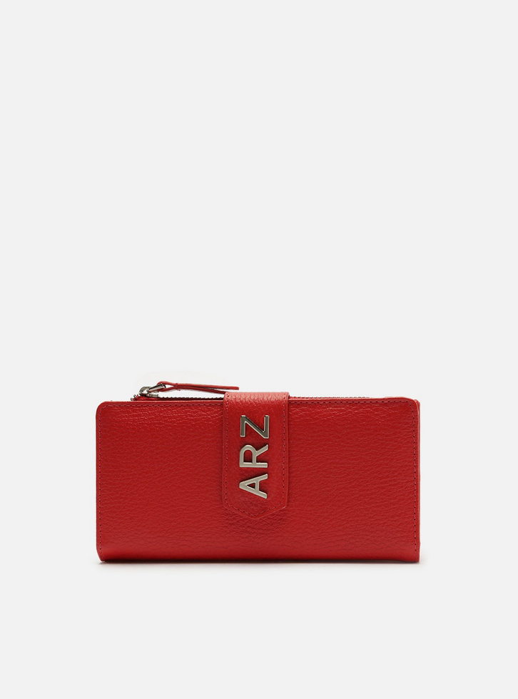 Carteira média feminina vermelha de couro. O acessório tem formato retangular e acabamento texturizado. Possui bolso superior com zíper e puxador e tira vertical com aplicação das letras ARZ em metal. Parte interna na cor da carteira com divisórias e porta-cartões.