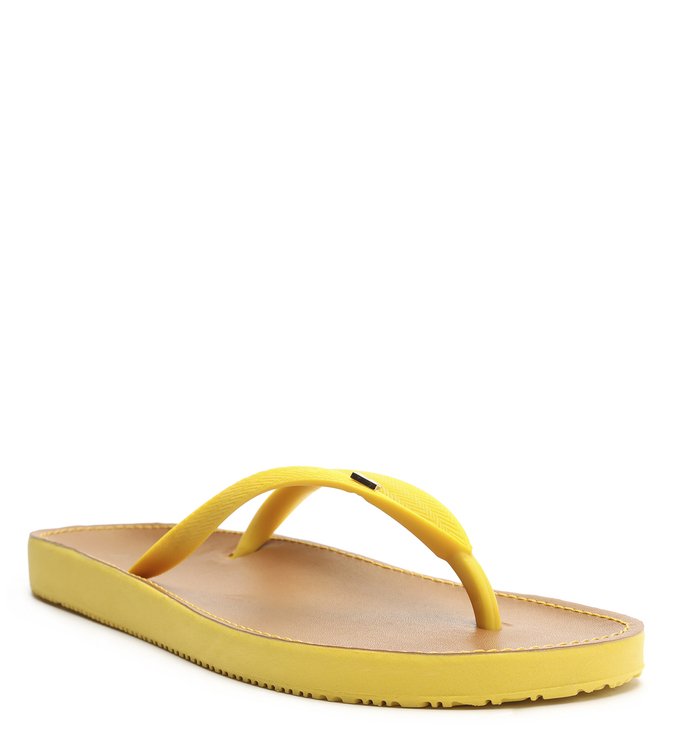 Chinelo de dedo amarelo em plástico injetado. O modelo tem sola rasteira flat emborrachada e palmilha marrom lisa com contorno em costura pesponto. De bico redondo, traz tiras finas injetadas, dividindo os dedos, e com aplicação de inscrição metálica do nome da marca em uma delas. Aberto, o chinelo de dedo exibe todo o pé.