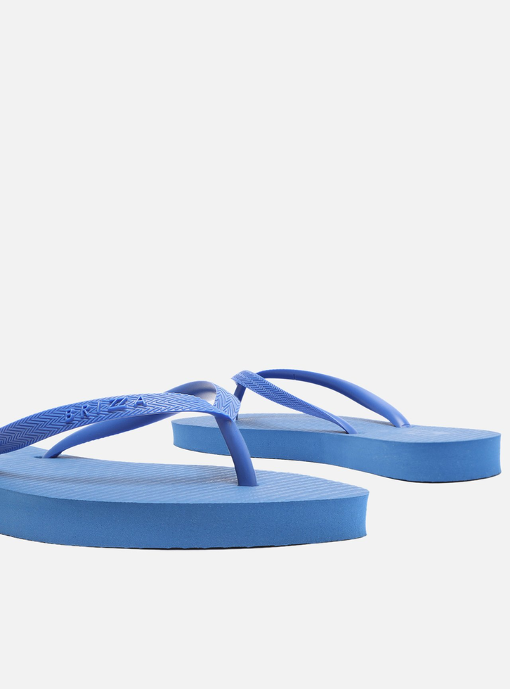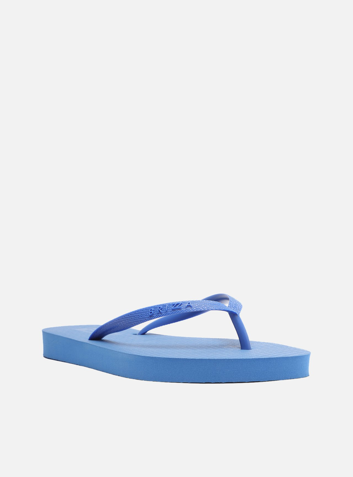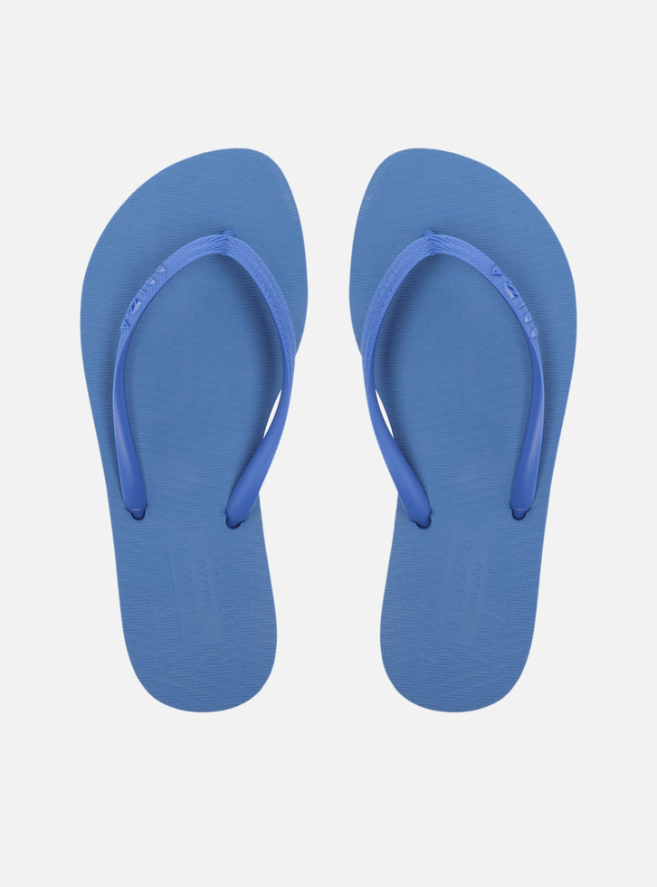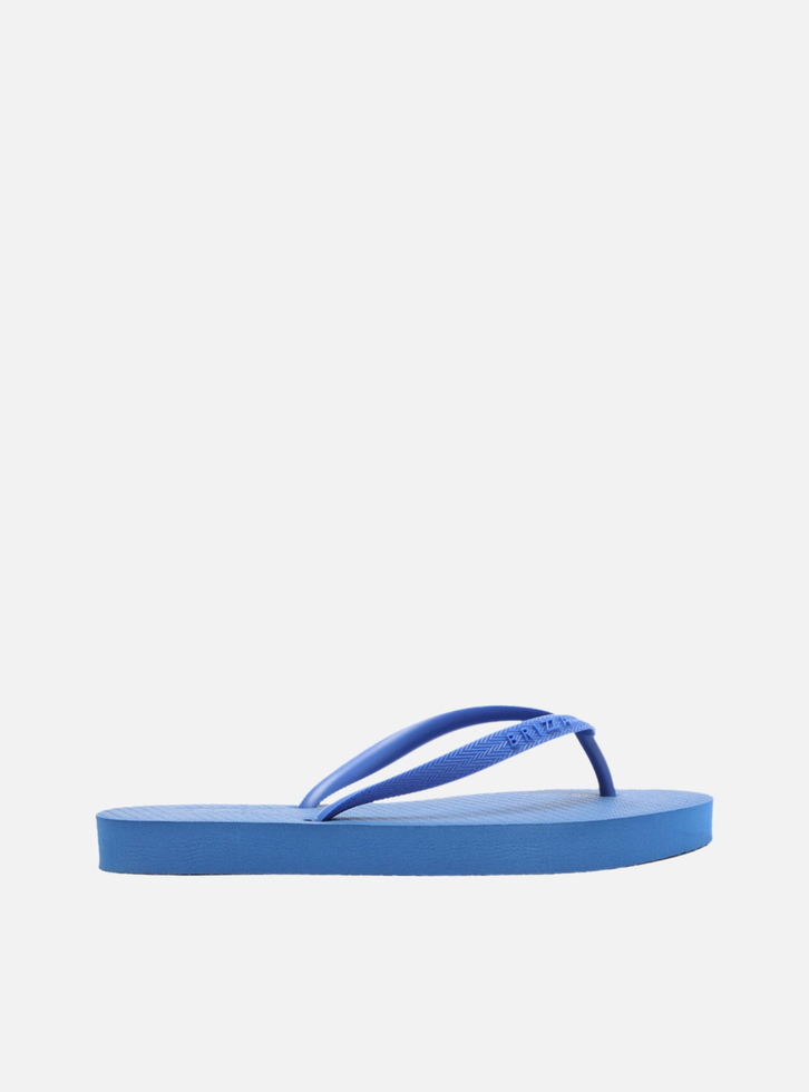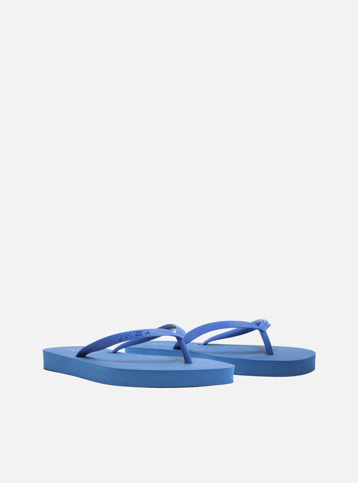 Chinelo de dedo azul. O modelo tem sola rasteira flat em borracha e palmilha texturizada. De bico redondo, traz tiras finas injetadas, dividindo os dedos, e com inscrição do nome da marca em alto-relevo em uma delas. Aberto, o chinelo de dedo exibe todo o pé.