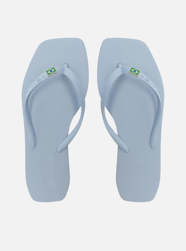 Chinelo de dedo azul. O chinelo tem sola flat emborrachada e palmilha texturizada com inscrição do nome da marca. Com formato quadrado na ponta, traz tiras finas injetadas, dividindo os dedos, e com aplicação Brizza e da bandeira do Brasil em uma delas. Aberto, o chinelo de dedo exibe todo o pé.