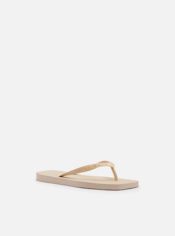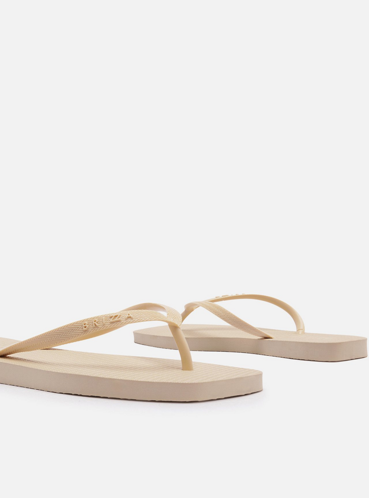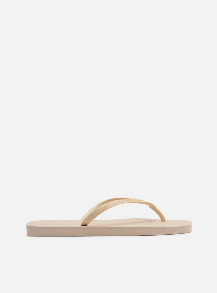 Chinelo de dedo bege. O sapato tem sola rasteira flat em borracha e palmilha texturizada. Com ponta quadrada, traz tiras finas injetadas, dividindo os dedos, e com inscrição do nome da marca em uma delas. Aberto, o chinelo de dedo exibe todo o pé.