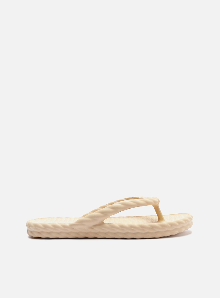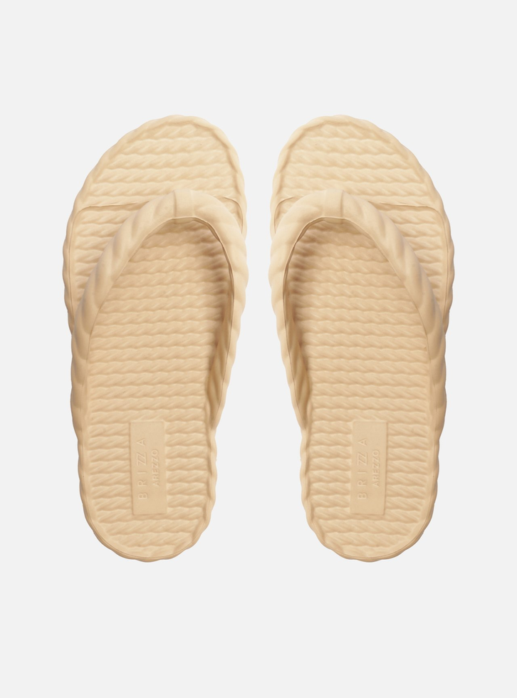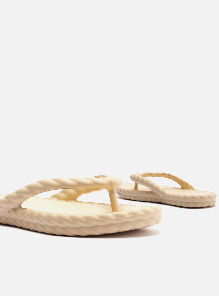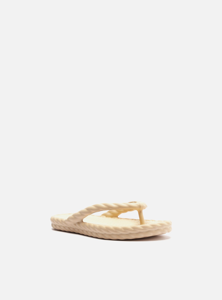 Chinelo de dedo bege em EVA. O sapato tem sola rasteira flat, solado em relevo que imita tiras de cordão torcido e palmilha texturizada com nome da marca. Com formato arredondado na ponta, traz tiras dividindo os dedos e também em forma de cordão torcido. Aberto, o chinelo de dedo exibe todo o pé.