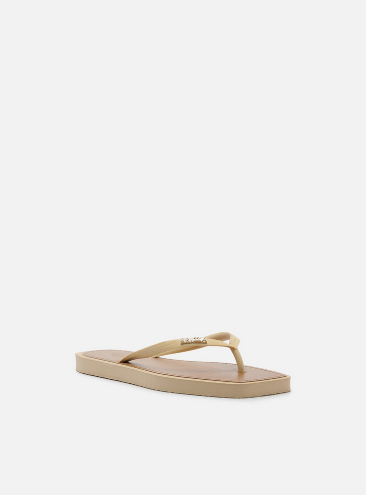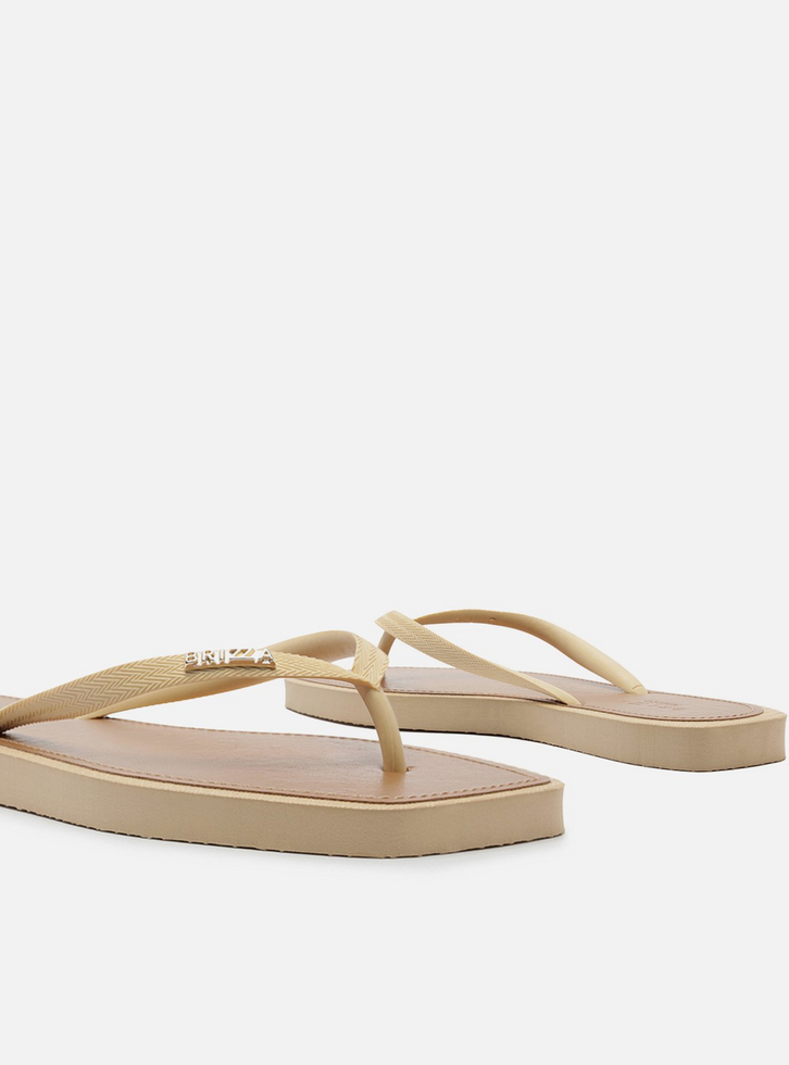 Chinelo de dedo bege. O sapato tem sola rasteira flat emborrachada e palmilha marrom lisa com contorno em costura pesponto e nome da marca. Com ponta quadrada, traz tiras finas injetadas, dividindo os dedos, com aplicação de inscrição metálica do nome da marca em uma delas. Aberto, o chinelo de dedo exibe todo o pé.