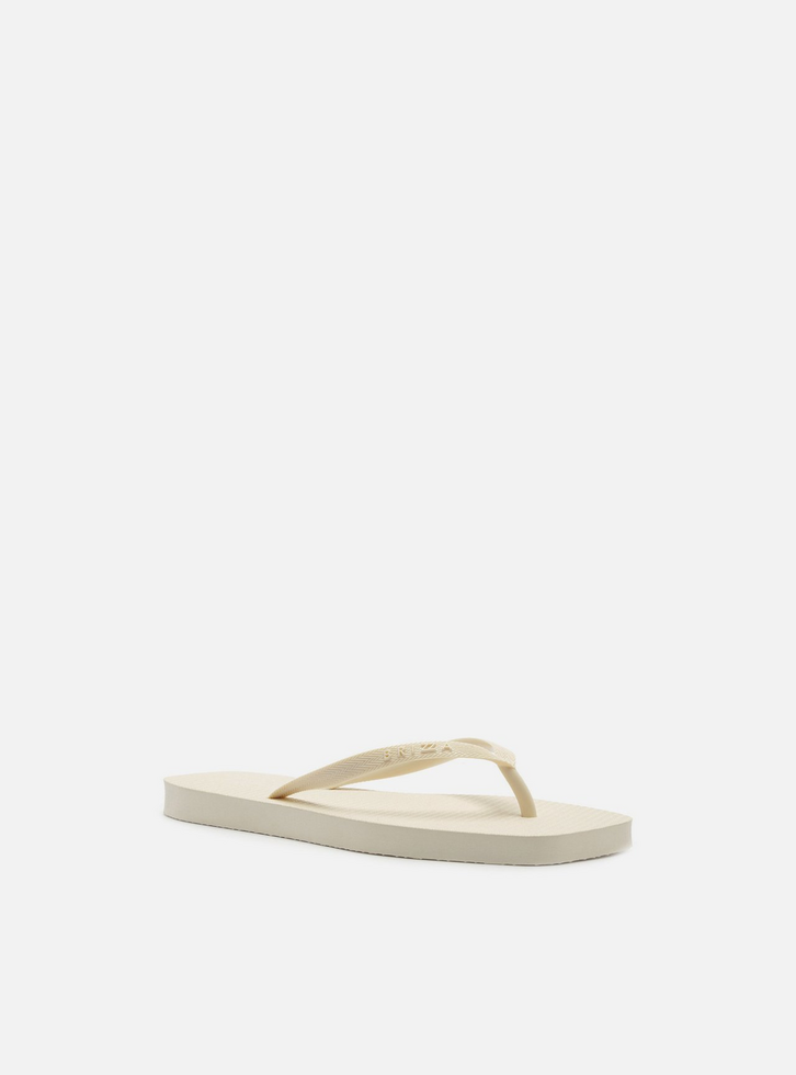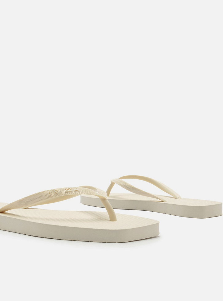 Chinelo de dedo branco. O sapato tem sola rasteira flat em borracha e palmilha texturizada. Com ponta quadrada, traz tiras finas injetadas, dividindo os dedos, e com inscrição do nome da marca em uma delas. Aberto, o chinelo de dedo exibe todo o pé.