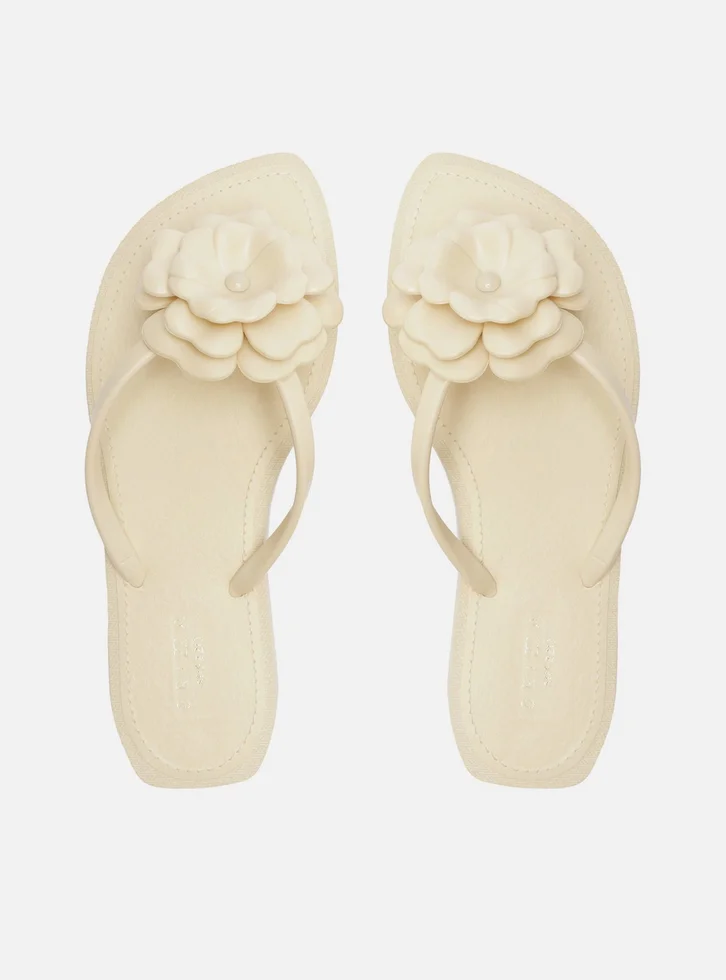 Chinelo de dedo branco. O sapato tem sola flat em borracha e palmilha lisa com contorno em costura pesponto e nome da marca. Com ponta folha, traz tiras finas texturizadas, dividindo os dedos, e com aplicação de flor grande no centro. Aberto, o chinelo de dedo exibe todo o pé.