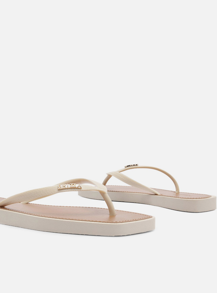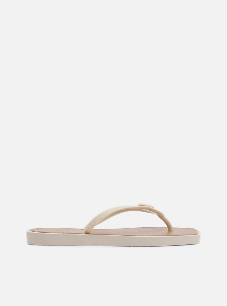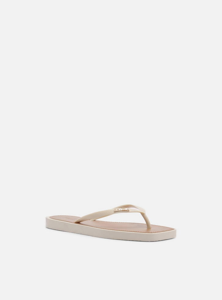 Chinelo de dedo branco. O sapato tem sola rasteira flat emborrachada e palmilha marrom lisa com contorno em costura pesponto e nome da marca. Com ponta quadrada, traz tiras finas injetadas, dividindo os dedos, com aplicação de inscrição metálica do nome da marca em uma delas. Aberto, o chinelo de dedo exibe todo o pé.
