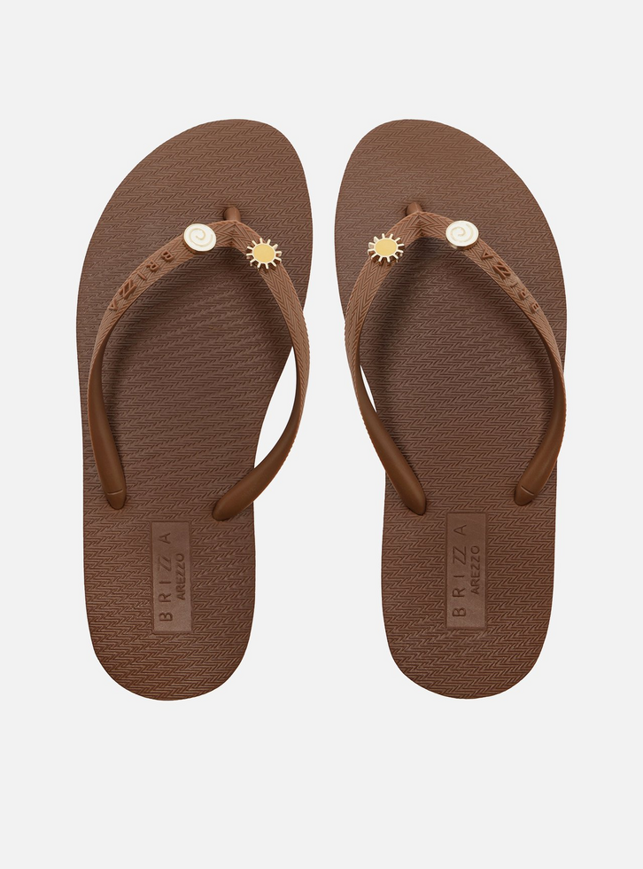 Chinelo de dedo marrom. O sapato tem sola rasteira flat emborrachada com listra contrastante nas laterais e palmilha texturizada com inscrição do nome da marca. Com formato arredondado na ponta, traz tiras que dividem os dedos e duas aplicações metálicas exclusivas da collab Brizza + Bacio Di Latte. Aberto, o chinelo de dedo exibe todo o pé.