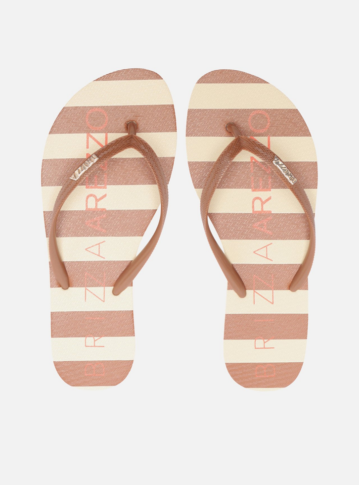 Chinelo de dedo marrom. O sapato tem sola rasteira flat emborrachada e palmilha estampada com listras e o nome Brizza Arezzo aplicado. Com formato arredondado na ponta, traz tiras finas que dividem os dedos e peça metálica com o nome da marca. Aberto, o chinelo de dedo exibe todo o pé.