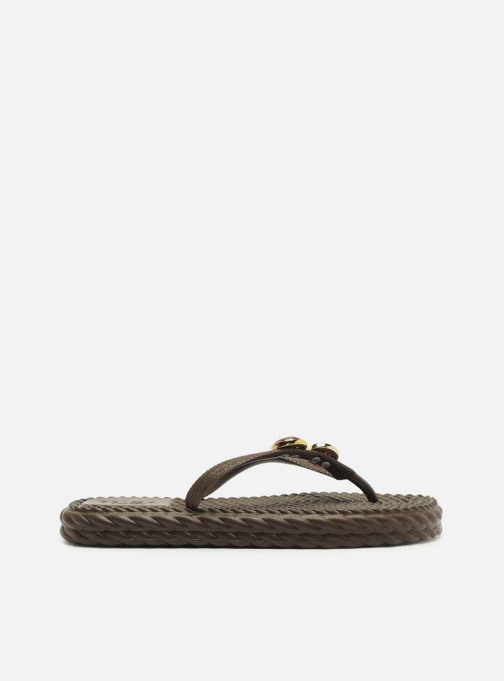 Chinelo de dedo marrom em EVA. O sapato tem sola rasteira flat, solado e palmilha em relevo que imita tiras de cordão torcido e nome da marca. Com formato arredondado na ponta, traz tiras finas dividindo os dedos e com aplicação de pedras em uma delas. Aberto, o chinelo de dedo exibe todo o pé.