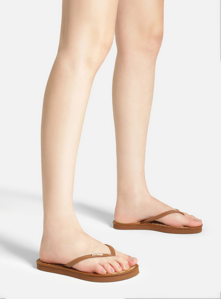 Chinelo marrom. O sapato tem sola rasteira flat emborrachada e palmilha em palha tramada com tag do nome da marca. Com formato arredondado na ponta, traz tiras finas, dividindo os dedos, e inscrição metálica do nome da marca aplicada em uma delas. Aberto, o chinelo de dedo exibe todo o pé.