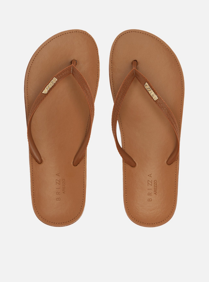 Chinelo de dedo marrom. O sapato tem sola rasteira flat emborrachada e palmilha lisa em recouro com contorno em costura pesponto e nome da marca. Com formato arredondado na ponta, traz tiras finas injetadas, dividindo os dedos, com aplicação metálica do nome da marca em uma delas. Aberto, o chinelo de dedo exibe todo o pé.