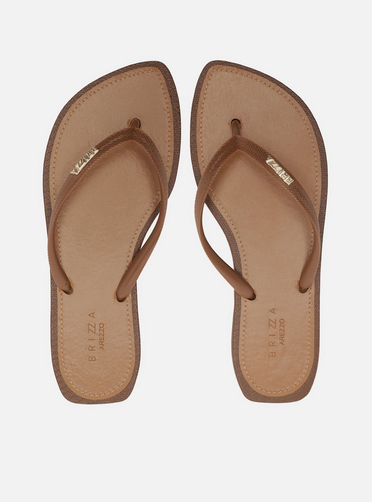 Chinelo de dedo marrom. O sapato tem sola flat em borracha e palmilha marrom lisa com contorno em costura pesponto e nome da marca. Com ponta folha, traz tiras finas texturizadas, dividindo os dedos, e com aplicação metálica do nome da marca em uma delas. Aberto, o chinelo de dedo exibe todo o pé.