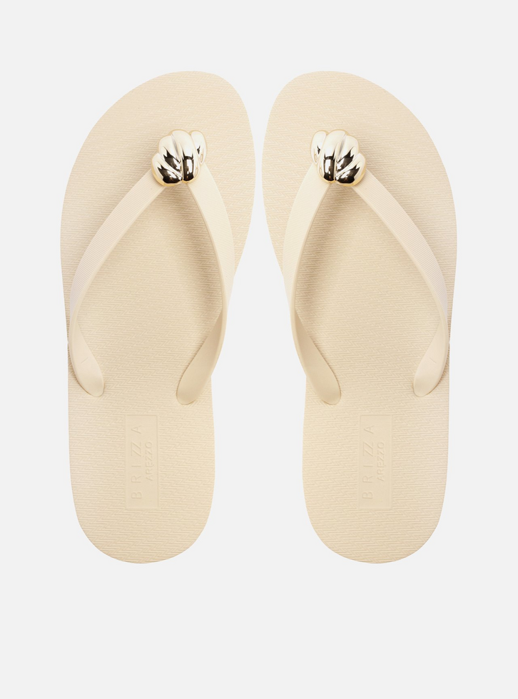 Chinelo de dedo off white. O sapato tem sola rasteira flat emborrachada e palmilha texturizada com inscrição do nome da marca. Com formato arredondado na ponta, traz tiras lisas que dividem os dedos, com aplicação de metal dourado texturizado no centro. Aberto, o chinelo de dedo exibe todo o pé.
