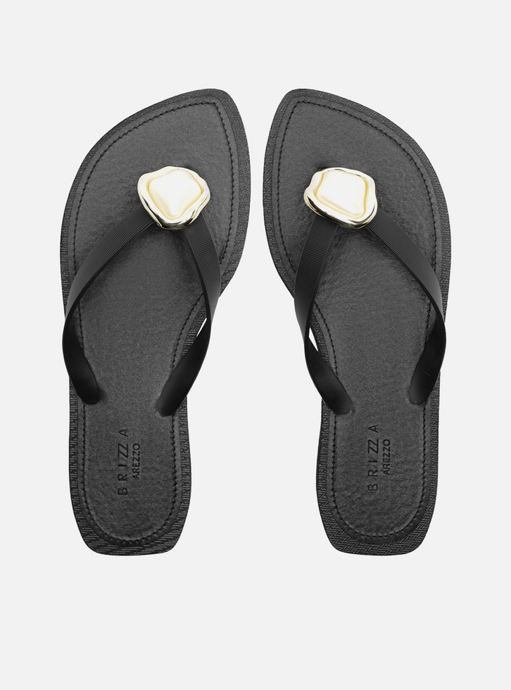 Chinelo de dedo preto. O sapato tem sola flat em borracha e palmilha preta lisa com contorno em costura pesponto e nome da marca. Com ponta folha, traz tiras finas texturizadas, dividindo os dedos, e com aplicação de pedra e metal orgânico no centro.