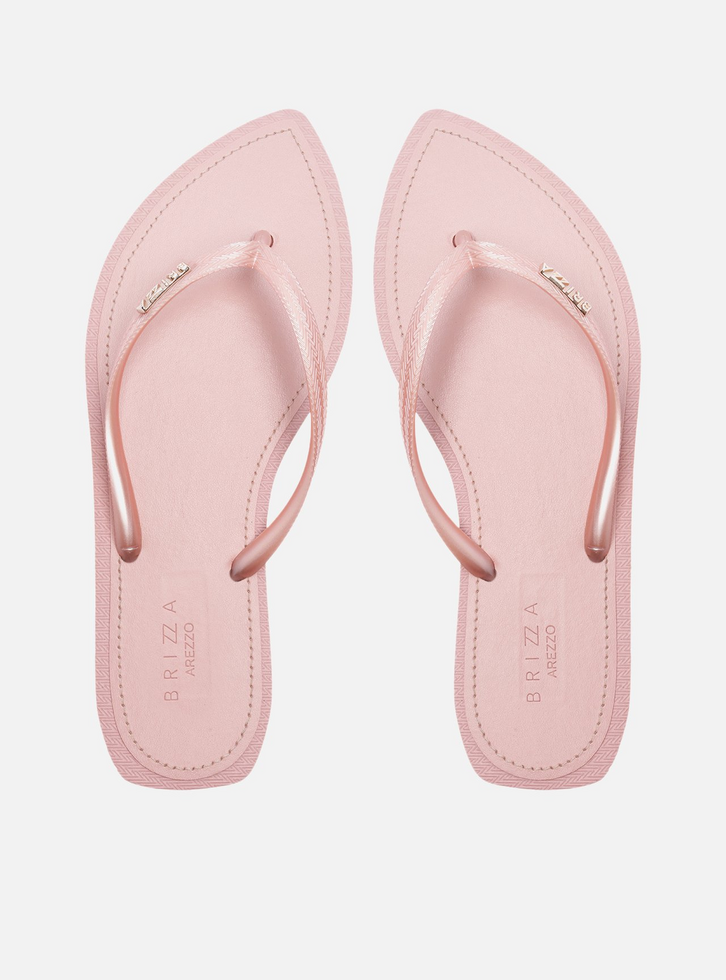Chinelo de dedo rosa. O modelo tem sola rasteira flat em borracha e palmilha lisa rosa. Possui bico folha, traz tiras finas injetadas, dividindo os dedos, e com aplicação metálica do nome da marca em uma delas. Aberto, o chinelo de dedo exibe todo o pé.