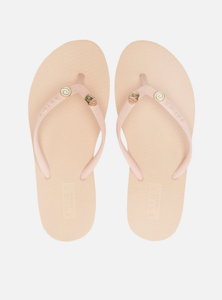 Chinelo de dedo rosa. O sapato tem sola rasteira flat emborrachada com listra contrastante nas laterais e palmilha texturizada com inscrição do nome da marca. Com formato arredondado na ponta, traz tiras que dividem os dedos e duas aplicações metálicas exclusivas da collab Brizza + Bacio Di Latte. Aberto, o chinelo de dedo exibe todo o pé.
