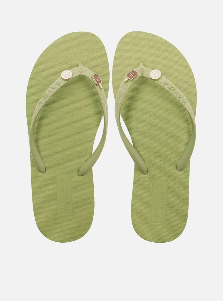 Chinelo de dedo verde. O sapato tem sola rasteira flat emborrachada com listra contrastante nas laterais e palmilha texturizada com inscrição do nome da marca. Com formato arredondado na ponta, traz tiras que dividem os dedos e duas aplicações metálicas exclusivas da collab Brizza + Bacio Di Latte. Aberto, o chinelo de dedo exibe todo o pé.
