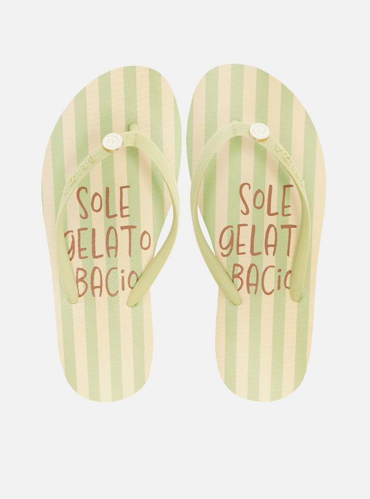 Chinelo de dedo verde. O sapato tem sola rasteira flat emborrachada e palmilha texturizada com estampa listrada e inscrição “Sole, Gelato, Bacio”. Com formato arredondado na ponta, traz tiras que dividem os dedos e charm metálico aplicado com o logo da Bacio Di Latte. Aberto, o chinelo de dedo exibe todo o pé.