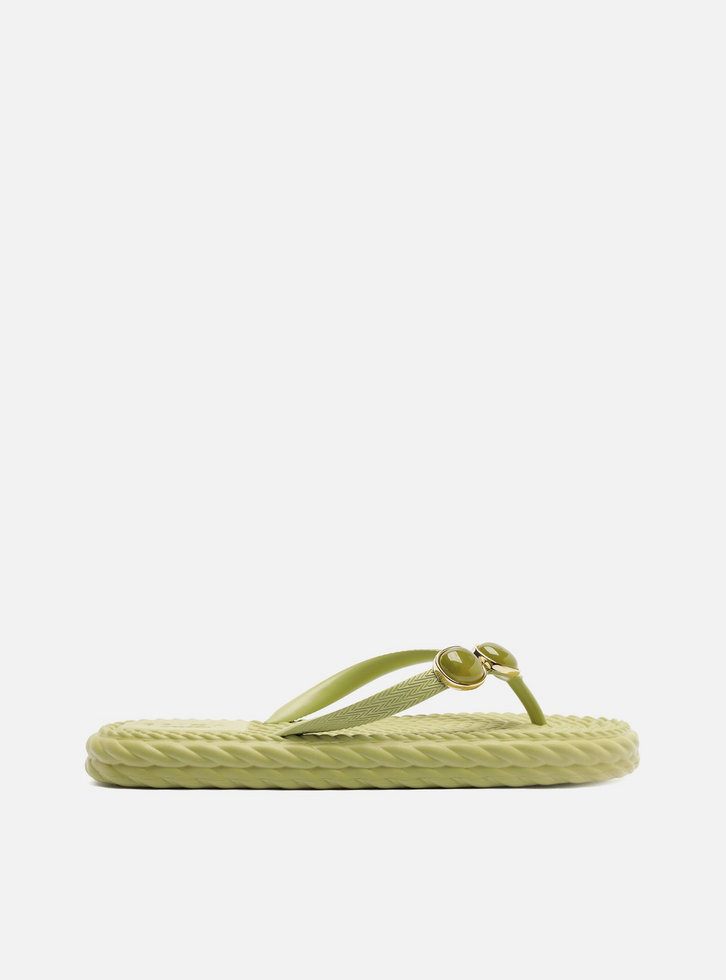 Chinelo de dedo verde em EVA. O sapato tem sola rasteira flat, solado e palmilha em relevo que imita tiras de cordão torcido e nome da marca. Com formato arredondado na ponta, traz tiras finas dividindo os dedos e com aplicação de pedras em uma delas. Aberto, o chinelo de dedo exibe todo o pé.