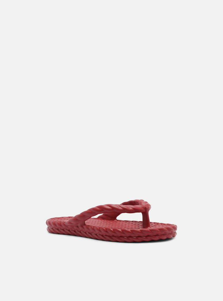Chinelo de dedo vermelho em EVA. O sapato tem sola rasteira flat, solado em relevo que imita tiras de cordão torcido e palmilha texturizada com nome da marca. Com formato arredondado na ponta, traz tiras dividindo os dedos e também em forma de cordão torcido. Aberto, o chinelo de dedo exibe todo o pé.