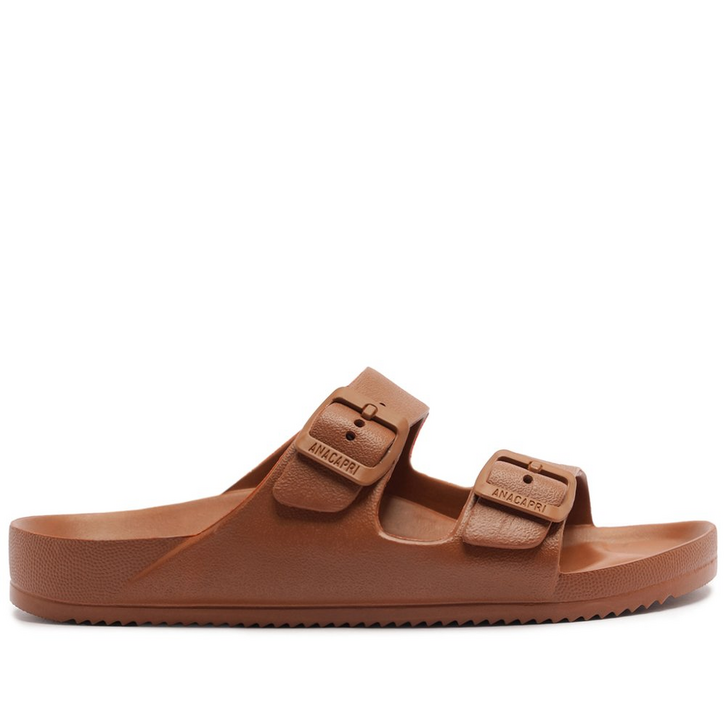 Chinelo Anacapri, em EVA injetado, na cor marrom. O modelo apresenta cabedal fechado nas laterais com duas tiras largas com recortes vazados sobre os dedos e no peito de pé, com detalhe imponente afivelado nas tiras em resina de mesmo tom do chinelo, com assinatura Anacapri. Com solado emborrachado levemente tratorado e palmilha anatômica, proporcionando conforto no calce.