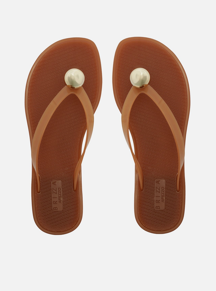 Chinelo feminino marrom em PVC com acabamento jelly. O sapato tem sola rasteira flat e palmilha texturizada com inscrição do nome da marca. Com formato arredondado na ponta, traz tiras finas injetadas que dividem os dedos, com aplicação de esfera metálica dourada no centro. Aberto, o chinelo de dedo exibe todo o pé.