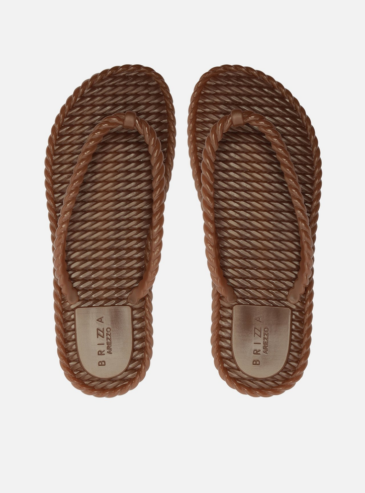 Chinelo de dedo marrom em PVC. O sapato tem sola rasteira flat, solado em relevo que imita tiras de cordão torcido e palmilha texturizada com nome da marca. Com formato arredondado na ponta, traz tiras finas dividindo os dedos, também em forma de cordão torcido. Aberto, o chinelo de dedo exibe todo o pé.