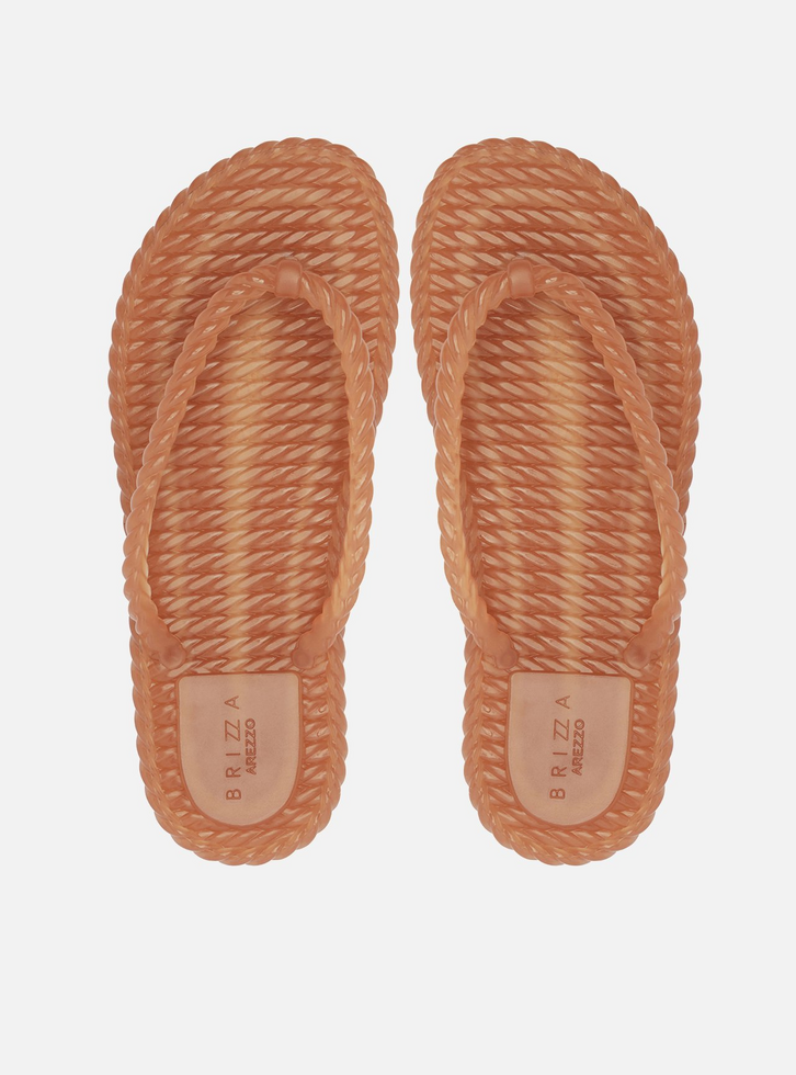 Chinelo de dedo marrom em PVC translúcido. O sapato tem sola rasteira flat, solado em relevo que imita tiras de cordão torcido e palmilha texturizada com nome da marca. Com formato arredondado na ponta, traz tiras finas dividindo os dedos, também em forma de cordão torcido. Aberto, o chinelo de dedo exibe todo o pé.