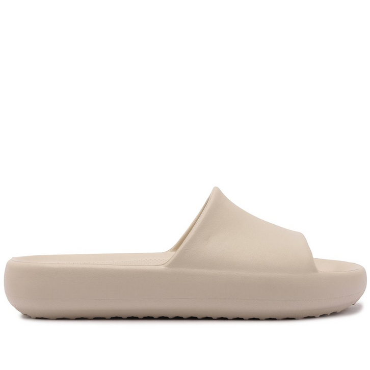 Chinelo Nuvem injetado, na cor bege. O modelo apresenta cabedal em EVA injetado, com solado emborrachado alto e texturizado, que afina na altura dos dedos. Com formato anatômico e leve tratorado na base. O chinelo nuvem traz uma tira mais larga sobre o peito do pé e assinatura Anacapri na palmilha. Deixa os dedos e calcanhar à mostra.