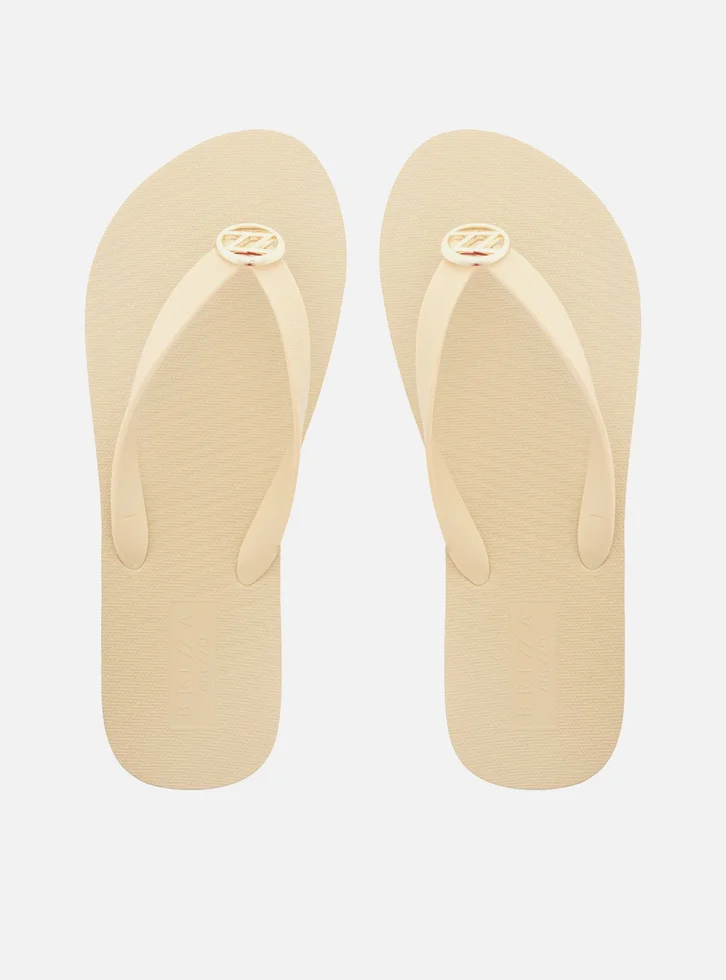 Chinelo feminino off-white. O sapato tem sola rasteira flat emborrachada e palmilha texturizada com nome da marca. Com formato arredondado na ponta, traz tiras finas injetadas, dividindo os dedos, com aplicação metálica vazada ZZ no centro. Aberto, o chinelo de dedo exibe todo o pé.