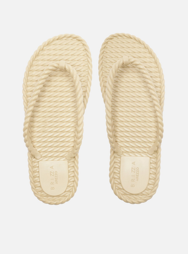 Chinelo de dedo off white em PVC. O sapato tem sola rasteira flat, solado em relevo que imita tiras de cordão torcido e palmilha texturizada com nome da marca. Com formato arredondado na ponta, traz tiras finas dividindo os dedos, também em forma de cordão torcido. Aberto, o chinelo de dedo exibe todo o pé.