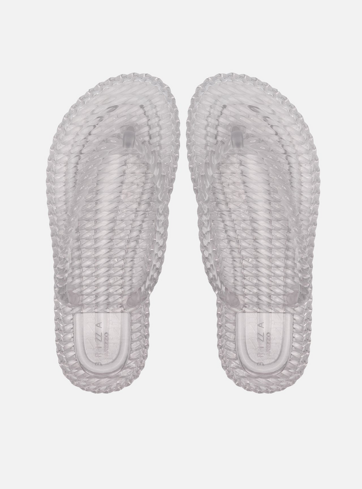 Chinelo de dedo transparente em PVC. O sapato tem sola rasteira flat, solado em relevo que imita tiras de cordão torcido e palmilha texturizada com nome da marca. Com formato arredondado na ponta, traz tiras finas dividindo os dedos, também em forma de cordão torcido. Aberto, o chinelo de dedo exibe todo o pé.
