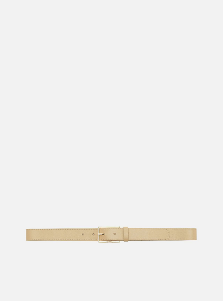 Cinto bege de couro. O acessório vem em tira média e possui fivela metálica dourada, quadrada e fina. Conta com passador na mesma cor do cinto e ajuste regulável.