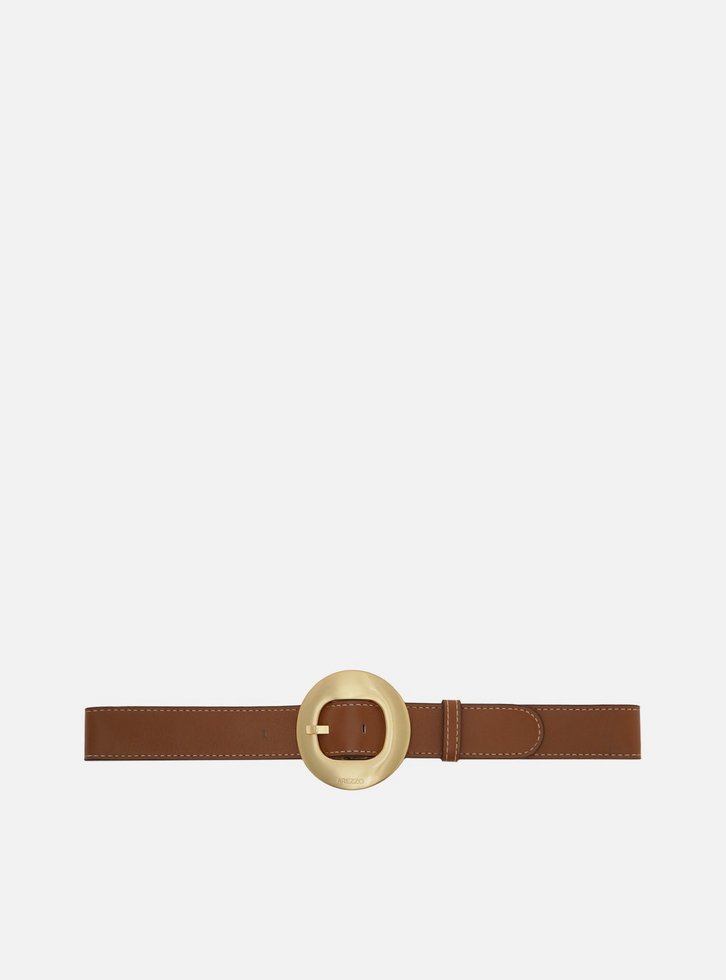 Cinto caramelo de couro. O acessório vem em tira larga com bordas marcadas por pesponto e possui fivela metálica dourada, redonda e robusta, com acabamento polido e inscrição do nome da marca. Conta ainda com passador em couro e fechamento ajustável.
