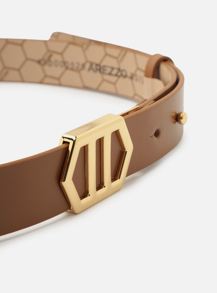 Cinto feminino marrom de couro em tira média. O acessório tem fivela metálica com formato geométrico e vazado. Parte interna em material com monograma Arezzo. Para uso na cintura, é ajustável por carrapeta e tem passador em tira de couro.