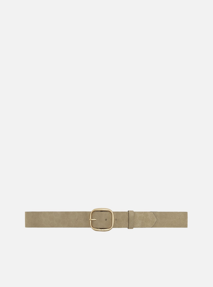 Cinto de couro acamurçado feminino cinza. O acessório vem em tira larga e possui fivela de metal, dourada e quadrada com cantos arredondados. Para uso na cintura, é regulável e tem passador em tira de couro.
