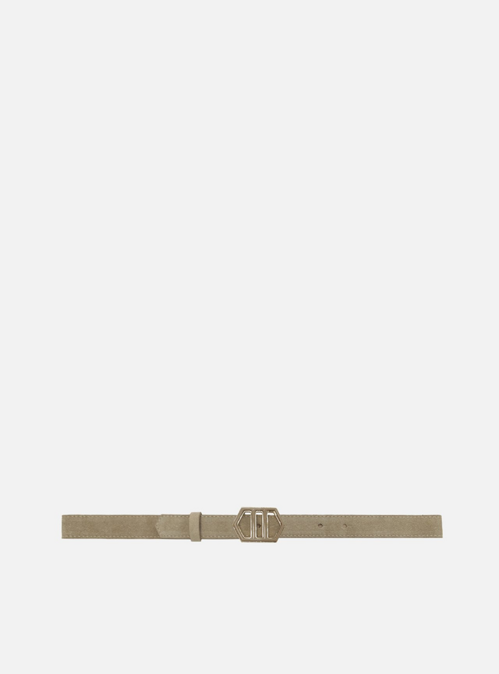 Cinto cinza de couro acamurçado. O acessório vem em tira fina e possui fivela de metal hexagonal. Para uso na cintura, é regulável e tem passador em tira de couro.