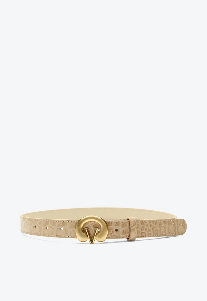 Cinto médio em croco bege. Clássico e versátil, esse modelo com textura croco e fivela frontal marcante adiciona sofisticação imediata ao visual. Combine com saias para um toque refinado, ou ainda sobre peças de tricô em dias mais frios, um truque de styling que une conforto e estilo com charme sofisticado.