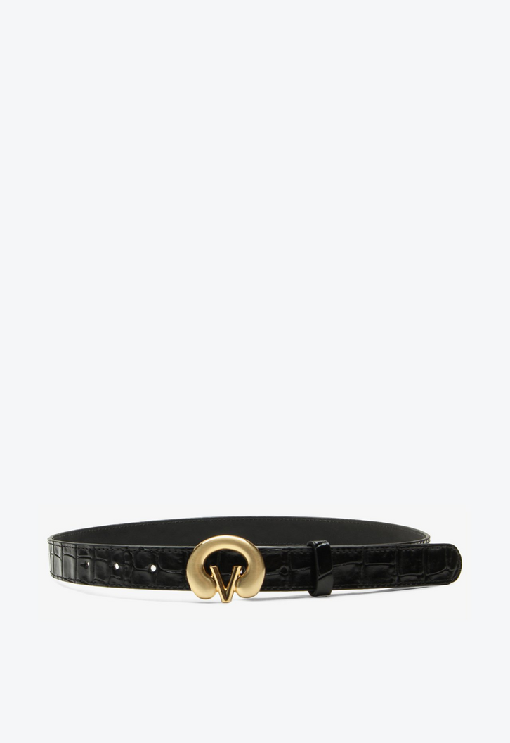 Cinto médio em croco preto. Clássico e versátil, esse modelo com textura croco e fivela frontal marcante adiciona sofisticação imediata ao visual. Combine com saias para um toque refinado, ou ainda sobre peças de tricô em dias mais frios, um truque de styling que une conforto e estilo com charme sofisticado.